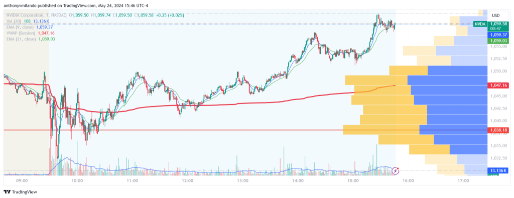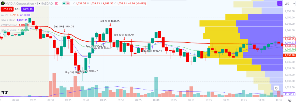 A few minutes after my initial trade, I attempted to go long above the 2-day VWAP but was stopped out. I then switched to a short position after observing the price holding below the 2-day VWAP, yet again, I was stopped out. After these trades, I decided to stop trading for the day and returned to my 9-5 job. Interestingly, NVDA later made a significant move higher after touching the 2-day VWAP again.