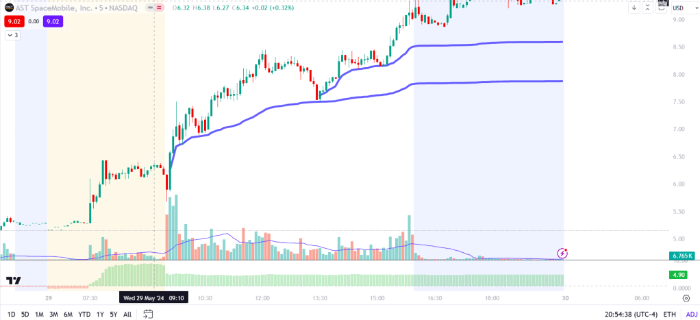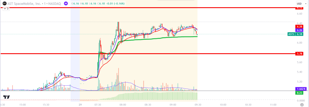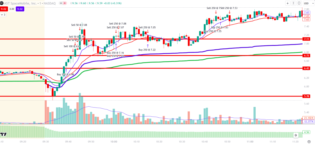 At the open, we immediately saw selling into the 5.78 level that we had broken in the premarket. The price bounced off this level and began using it as support. I didn’t enter the trade when we broke through the two anchored VWAPs (the green VWAP is anchored to the premarket, and the blue VWAP is anchored to the market open). I hesitated to purchase immediately because we were just below the premarket high, and I wanted to see if we would break this level.