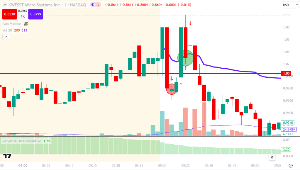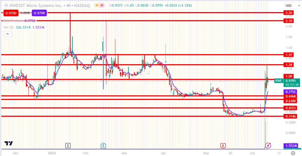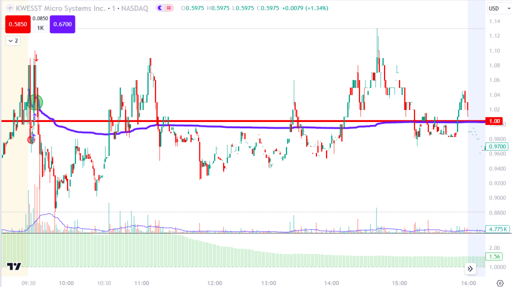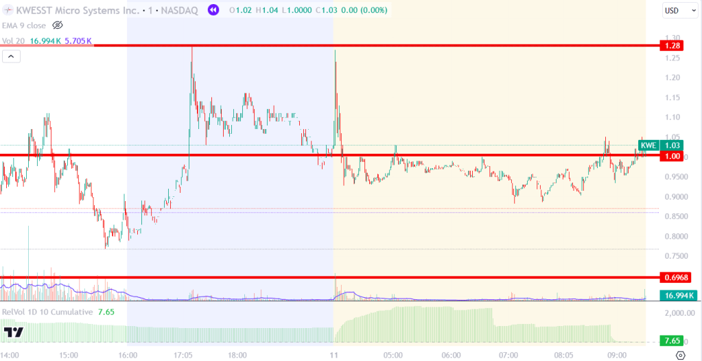 KWE surged to a new high in pre-market trading following the announcement of their $48 million contract. The stock experienced a significant gap up of over 18%, accompanied by massive pre-market volume. Early in the pre-market session, trading volume was 2,000 times higher than usual, but this dropped considerably as the market open approached, stabilizing at around 7 times the normal volume. The $1.00 level emerged as a crucial point in pre-market trading. If the stock could maintain this level and stay above the VWAP, it would present a long opportunity up to $1.28. Conversely, if the stock failed to hold this level and was rejected by the VWAP, it would indicate a short opportunity down to $0.6968.