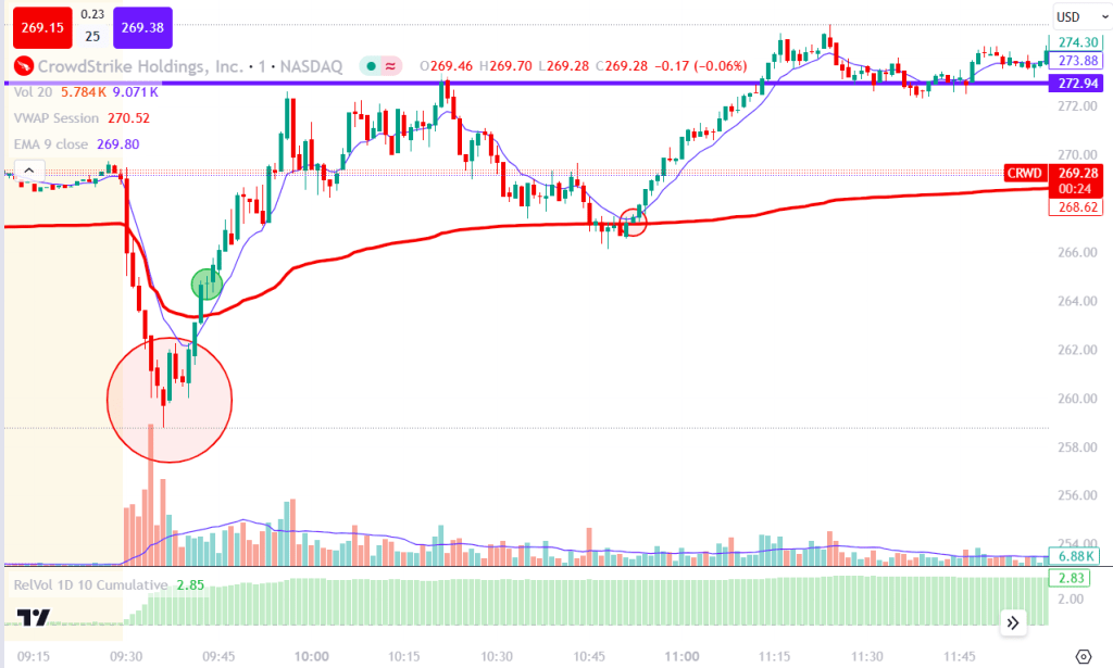 CRWD opened with a significant drive to the downside, then reversed after a large bullish candle cleared the highs of the previous two candles. Although this candle resembled a rubber band scalp entry, we were too close to VWAP to achieve a favorable risk-to-reward ratio. I did not enter here, but I did note it as a reversal signal. We then broke through VWAP, where I entered a long position (marked by the green circle). I took profits on the first pullback and the extension up to the blue level. I completely exited during the first rejection of the key level. This was a very successful trade, especially since it moved in my favor immediately. Using the 9 EMA for trend following was advantageous. Shortly after, the price returned to VWAP and bounced cleanly. I didn’t enter this trade, but this would have been an excellent opportunity for another long position. My final thoughts are that the failed opening drive pattern is becoming easier and easier to recognize. I am creating a list of screenshots here: Opening Drive Fail. Quickly viewing these images everyday has given me the confidence to enter without hesitation. I will continue to add to this list of screenshots every time I spot this setup.