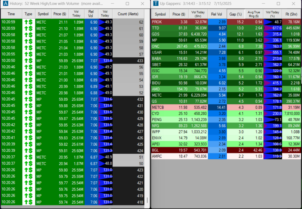 MP was gapping up 11% to 52 week highs and right around its all-time high. MP was on my original gapping up list, but I was not actually paying attention to it until it repeatedly popped up on the “52 Week High/Low with Volume” scanner. I noticed around 10am (the screenshot only goes back to 10:20am) that MP was making continuous highs due to the alert count climbing into the 400s. This essentially alerts me when a stock’s price is making a new 52 week high every time it prints. Therefore, the fact that I was seeing hundreds of alerts indicated that we were not only breaking highs but doing so with momentum. Fundamentally, the move was a result of Apple Inc. making a new commitment of $500 million to buy “American-made rare-earth magnets” from the Las Vegas-based materials company. The magnets will come from MP Materials’ flagship facility in Fort Worth, Texas, which Apple is helping to build out, the iPhone maker said.